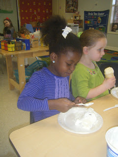 Ms. Amy found a fun snack craft to compliment our igloo construction! We used cake cones with a scoop of ice cream, covered them with whipped cream, then made a design of blocks using plastic knives. They were yummy!